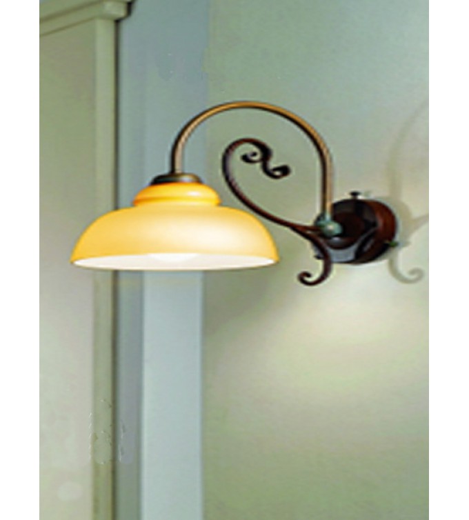 This wall sconce is part of the RANCH collection which is known for it's layered glass with detailed brass and ironwork . The 1909's blown multilayer glass and fine iron details define this light fixture's rustic, oldworld character. The 1909 is well-suited for wall applications where lighting can be reflected off adjacent walls and ceilings to provide a room with indirect lighting. This wall sconce goes well in all rooms. When mounted in art galleries, this sconce becomes a focal point of the art collection while better illuminating the other pieces. When mounted in smaller rooms such as powder bathrooms, the fixture floods the small space with a soft, warm light and adds elegant character to the space. Available metal finishes include OTA and RG and available shades are 21 and 31.