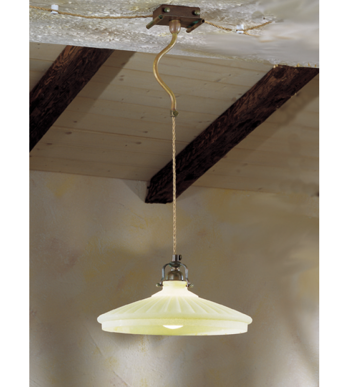 This pendant is part of the COUNTRY GREEN collection which is known for its craftsmanship, rich details, and rustic elegance . The 1864's Handmade Venetian shades and beautifully sculpted fixture frame complement one another and evoke a sense of old-world flare wile providing a dependable source of light. This fixture is an extremely unique piece of art, well suited for rustic spaces and more contemporary areas in need of character. The 1864 is well-suited for areas were a large chandelier is overbearing and a ceiling mount does not optimize impact. It works especially well in dining rooms, over kitchens islands, bars, wine cellars/ tasting rooms, and any other space in which a beautiful, subtle touch is needed to brighten up the room, both with light and style. Available metal finishes include GA and RG and available shades are 40, 20, 50 and 90.