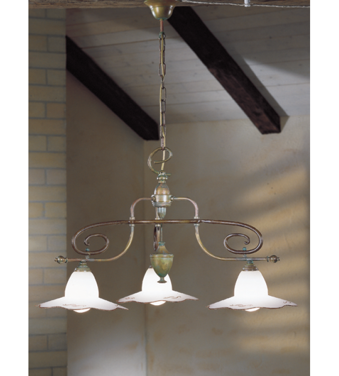 This chandelier is part of the COUNTRY LINE collection which is known for its unique design and modest old-world flare . The 1834's beautiful Florentine metal work and wide brimmed Venetian shades come together in a distinctive way giving this fixture a rustic undertone while maintaining its functionality and romantic look. The 1834 is well-suited for centers of rooms, vaulted ceilings, kitchens, dining rooms, living rooms, bars, foyers, billiards, and any other space with room to display a ceiling mounted work of art. Have this fixture be the first thing guests see when they enter your home or mount it in your dining room to enhance your banquet experiences. This fixture can breath life into all spaces and serve as a great talking point when entertaining guests . Available metal finishes include GA and RG and available shades are 20 and 90.