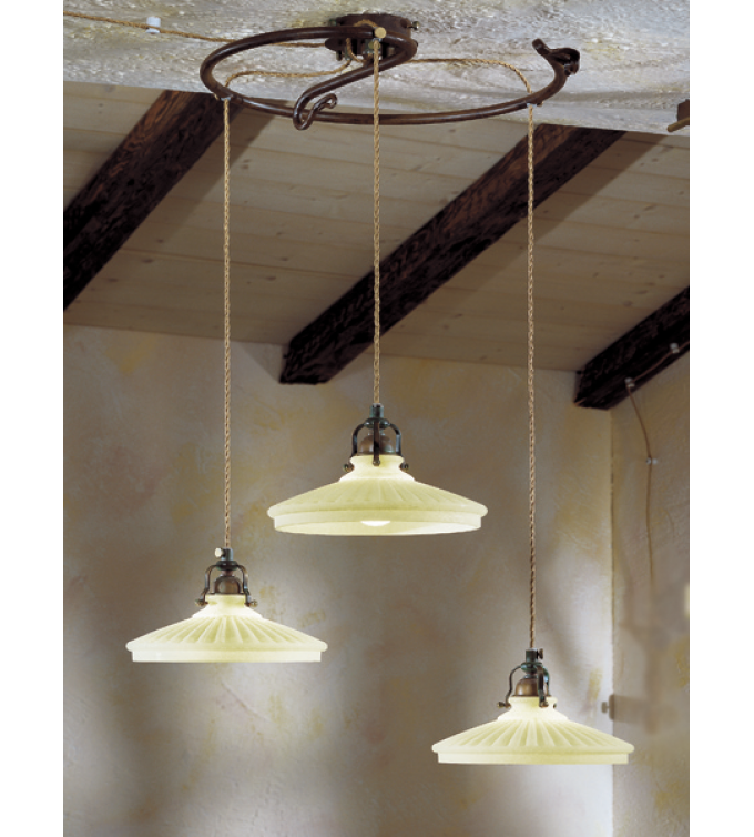 This pendant is part of the COUNTRY GREEN collection which is known for its craftsmanship, rich details, and rustic elegance . The 1870's Handmade Venetian shades and beautifully sculpted fixture frame complement one another and evoke a sense of old-world flare wile providing a dependable source of light. This fixture is an extremely unique piece of art, well suited for rustic spaces and more contemporary areas in need of character. The 1870 is well-suited for areas were a large chandelier is overbearing and a ceiling mount does not optimize impact. It works especially well in dining rooms, over kitchens islands, bars, wine cellars/ tasting rooms, and any other space in which a beautiful, subtle touch is needed to brighten up the room, both with light and style. Available metal finishes include GA and RG and available shades are 40, 20, 50 and 90.